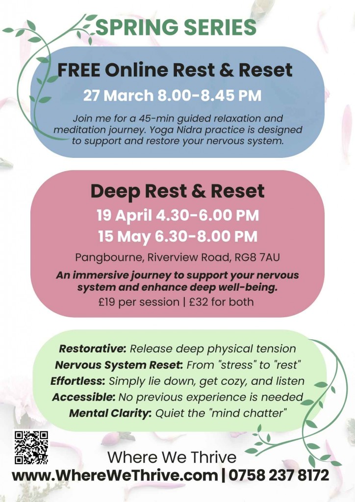 I’m delighted to invite you to the Spring series of Yoga Nidra events, designed to guide you into deep relaxation and enhance your overall wellbeing.